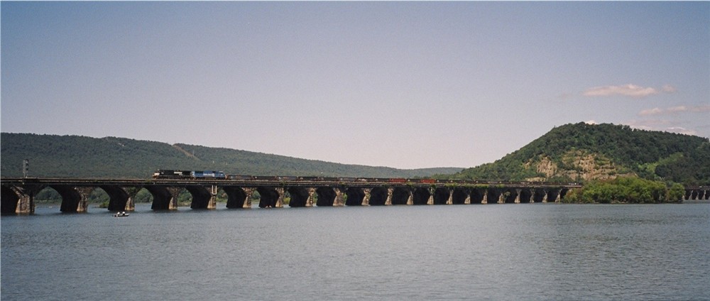 ![]() The Pennsylvania Railroad Bridge over The Susquehanna River at Harrisburg, PA looking north with the long since vacated Reading Railroad Bridge in the background along with Harrisburg's fame River Walk / River Front Park. |